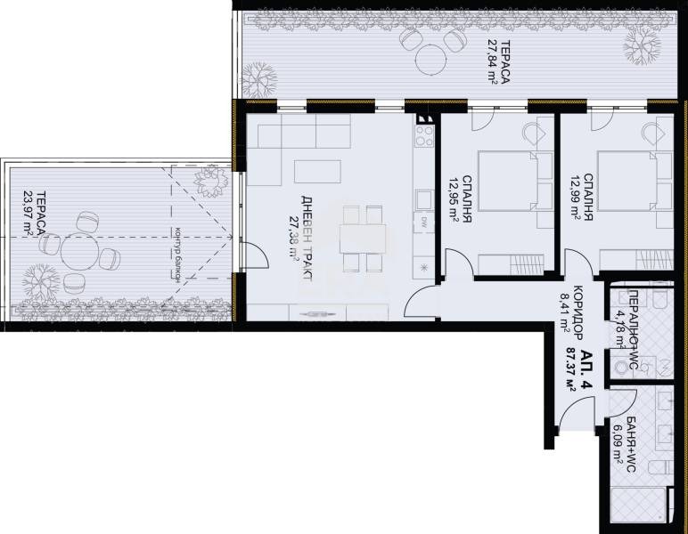 ЕРА Вива продава тристаен апартамент в новострояща се жилищна сграда в кв. Бриз, в близост до Кауфланд, гр. Варна. Имотът е със застроена площ от 87.37 кв.м. /106.06 кв.м. с общите части/ и се състои от коридор /8.41 кв.м./, функционална дневна зона с кухненска част и трапезария /27.38 кв.м./, две просторни и светли спални /12.95 кв.м. и 12.99 кв.м./, баня с тоалетна /6.09 кв.м./, перално помещение /4.18 кв.м./ и две тераси /23.97 кв.м. и 27.84 кв.м./. Обширно и добре разпределено пространство, което може да бъде адаптирано според вашите нужди и предпочитания. Жилището се издава завършено по БДС, на шплакловка и замазка, с поставена PVC дограма и външна блиндирана врата.