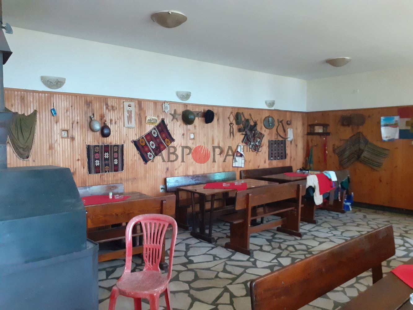 На първия етаж има обособена зала за хранене в битов стил, 2 санитарни възела за клиенти, кухня с широки сервизни помещения, санитарни възли и баня за персонала.