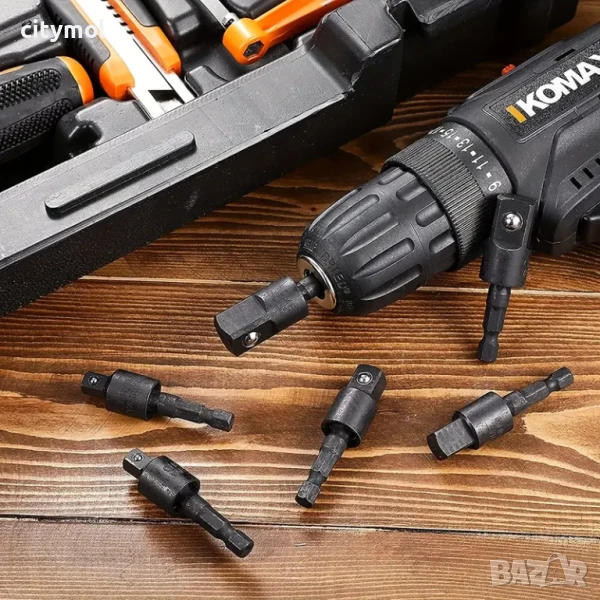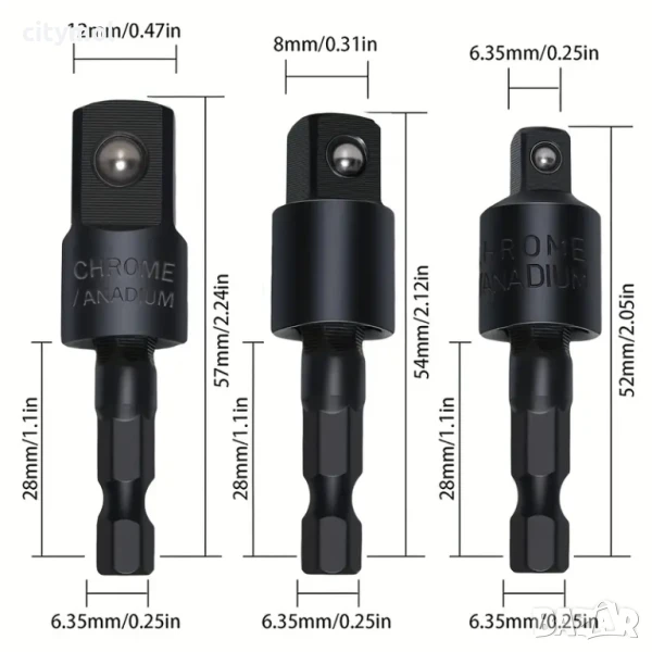 Комплектът включва 3 размера: 1/4" до 1/4", 3/8" и 1/2" шестостенни адаптери. Те ще превърнат вашата електрическа бормашина или ударен винтоверт в многофункционален високоскоростен винтоверт.
