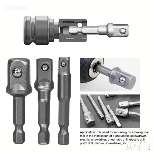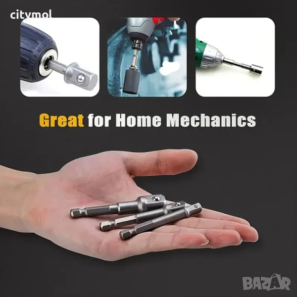 Комплектът включва 3 размера: 1/4" до 1/4", 3/8" и 1/2" шестостенни адаптери. Те ще превърнат вашата електрическа бормашина или ударен винтоверт в многофункционален високоскоростен винтоверт.