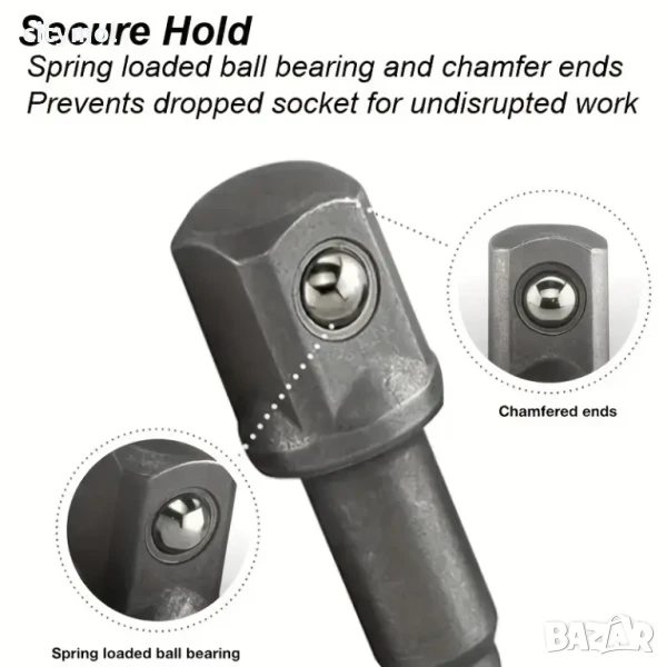 Всеки адаптер е вграден с пружинна опъваща топка от неръждаема стомана, за да се осигури бързо и здраво заключване. Свързаният гаечен ключ ще остане на място за тежка работа.