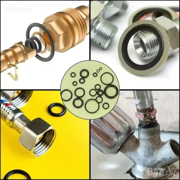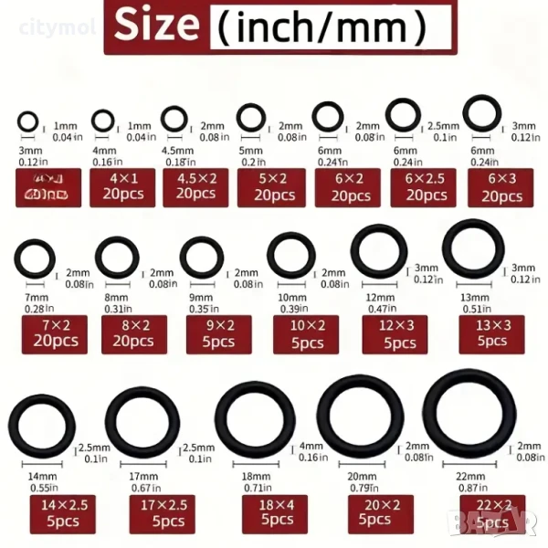 Практичен комплект от 225 гумени O-пръстени. Съдържа комбинация от 18 различни размера. О-пръстените са изработени от каучук, устойчив на агресивни фактори като горива, масла и химикали, както и висока температура.