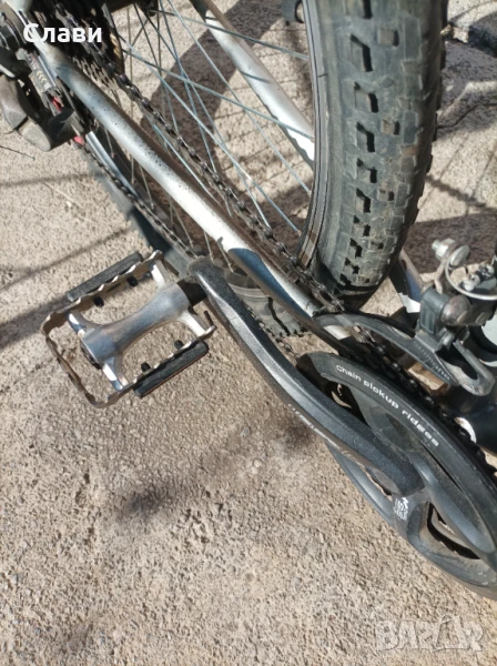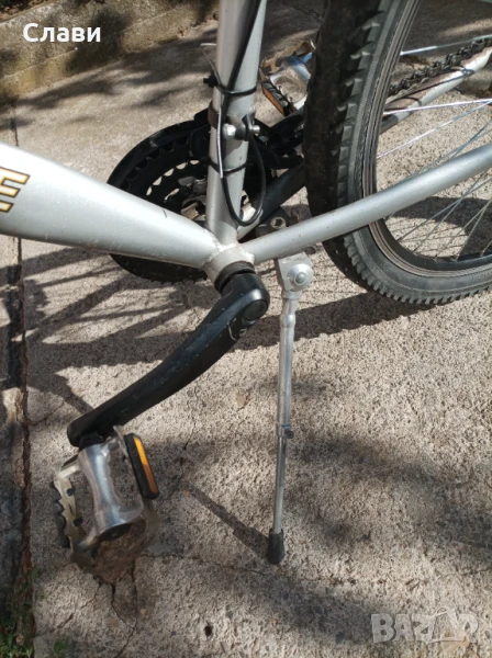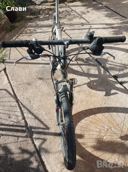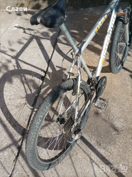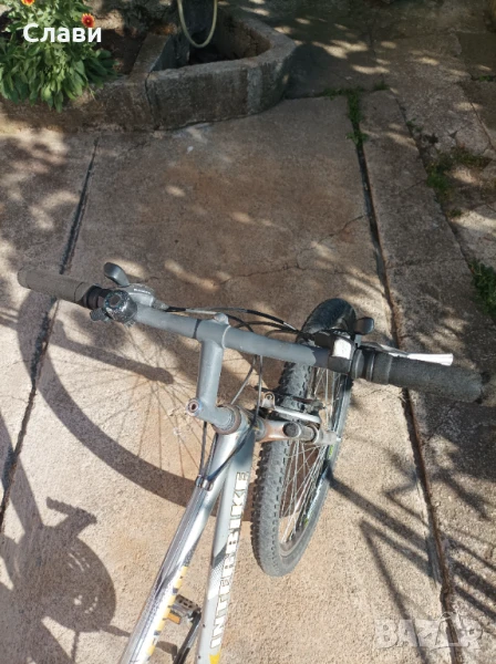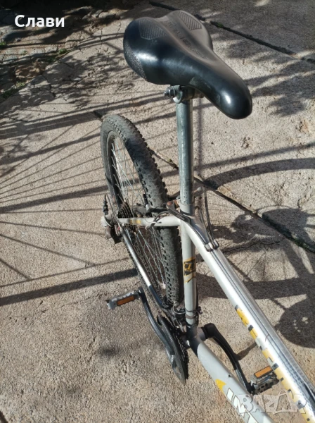 Велосипеда е използван.Състоянието може да се прецени от снимките..Има лувт в предната вилка.Гуми напомпани ,работещи 18 скорости.
