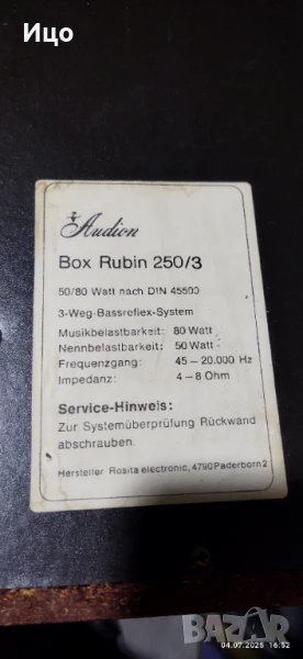 50 w sinus,80w музикална.45-20Кхц,4-8 ома.Размери 50/31/20 в см.Отлично запазени немски винтидж колони,черешов фурнир.Приятен мощен и мелодичен звук.Дължина.на кабела около 4 метра.Отпред блендите са чисти и здрави ,залепени не се свалят.Тест на място е най добре.