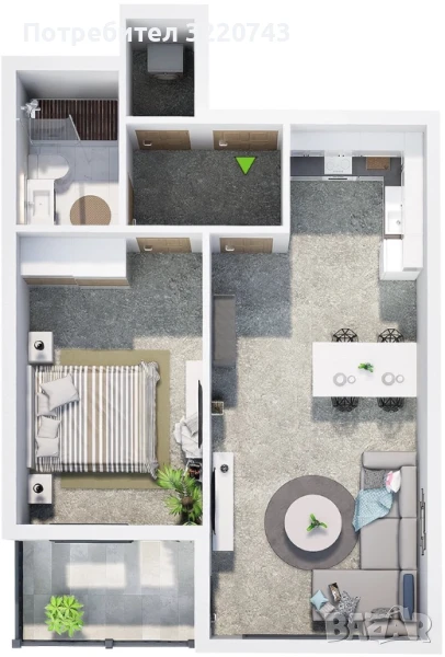 бокс, спалня, баня с тоалетна и тераса. Жилището е проектирано с акцент върху