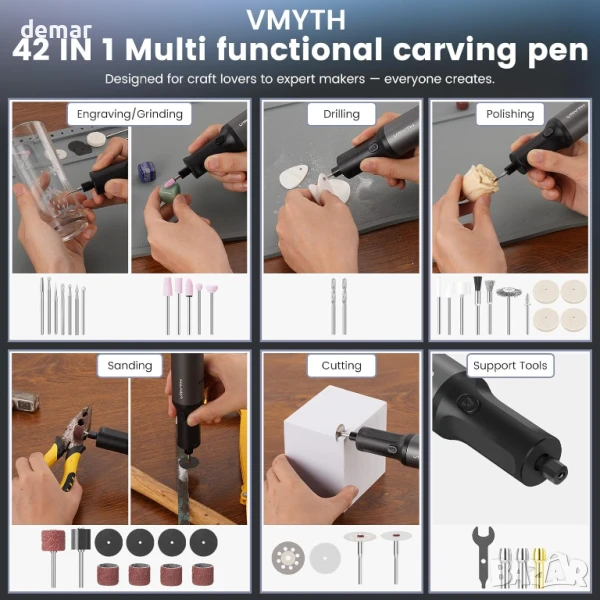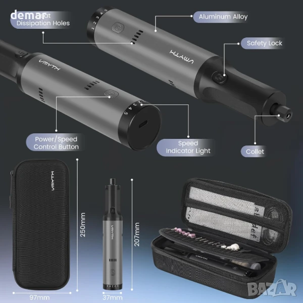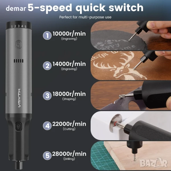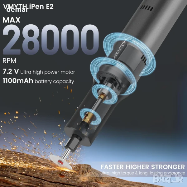 Гравиращата писалка VMYTH iPen E2 съчетава мощен 7.2V мотор с висок въртящ момент и пет променливи скорости до 28 000 об/мин, идеална за прецизна работа върху различни материали. Работи до 50 минути с едно зареждане и включва бързо зареждаща се батерия с капацитет 1100mAh. Вградена охладителна система с голям вентилатор и многовентилационен дизайн предотвратява прегряване, осигурявайки дълъг живот на мотора и стабилна работа. Ергономичният алуминиев корпус е лек и тих, с LED индикатори за скорост и интуитивно управление за лесно боравене. Предлага се с 44 универсални аксесоара и модулен калъф, което я прави подходяща за гравиране, шлайфане, рязане, полиране и пробиване в домашни условия, студио или работилница.