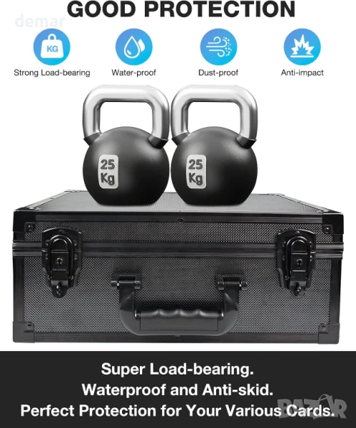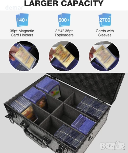 Тази кутия за съхранение на колекционерски карти предлага висококачествена, професионална организация за над 600 карти с горно зареждане, над 2700 карти в ръкави и 140 магнитни държача, с шест вътрешни слота и подвижни разделители за гъвкаво сортиране. Нейният елегантен и издръжлив дизайн е подходящ за колекционери на стандартни, градирани и карти с необичайна форма, като същевременно служи и като място за съхранение на твърди дискове или малки принадлежности. Лека и преносима с тегло от 1,9 кг, тя е идеална за домашна употреба, транспорт или търговски събития. Системата за заключване с двойно заключване и ключове добавя основна сигурност за защита на ценни колекции.