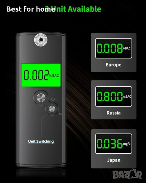 Гласова аларма и цветова разлика: алкохолният тестер е оборудван с интелигентно разпознаване, което показва различни цветове и предупредителни резултати в зависимост от съдържанието на алкохол, което позволява по-интуитивно наблюдение на данните и прави пътуването по-безопасно. Диапазонът на измерване е от 0 до 0,199% BAC. Можете да натиснете бутона M, за да превключвате между различните мерни единици: %BAC, ‰BAC и mg/L.