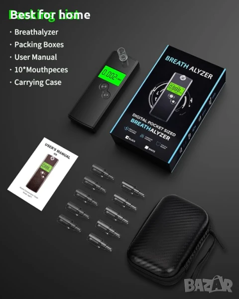 Сменяеми мундщуци: алкохолният тестер е оборудван с 10 сменяеми и миещи се мундщука и е подходящ за лична употреба, семейни тържества, социални събития и други поводи. Забележка: След консумация на алкохол, изчакайте 20 минути, преди да използвате алкохолния тестер. Извършете три последователни теста и определете средната стойност, за да осигурите точност.
