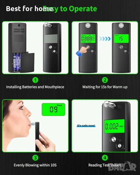 Лесен за употреба: просто поставете 3 батерии AAA (продуктът не съдържа батерии), поставете мундщука и включете устройството. След фаза на загряване от 15 секунди, духнете в алкохолния тестер за 5 секунди. Резултатът от вашето съдържание на алкохол в кръвта се показва веднага на яркия, лесен за четене LCD екран.