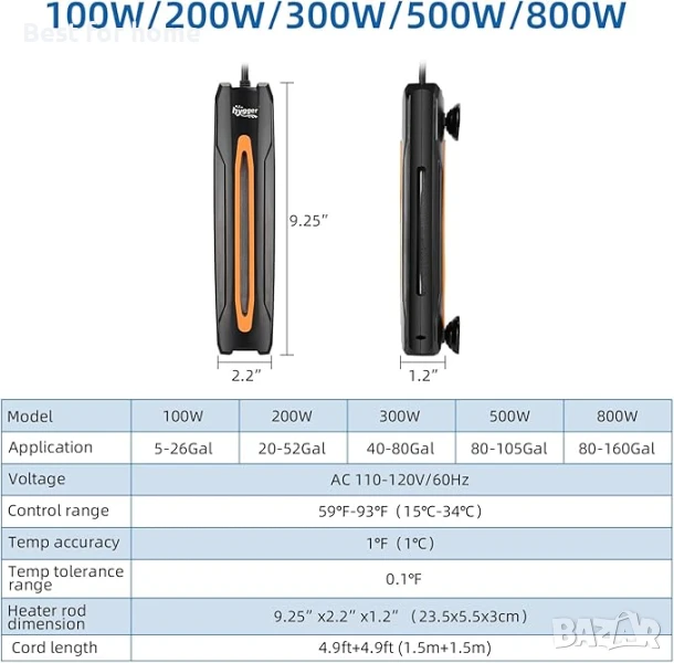 hygger 100W нагревател за аквариум, кварцов нагревател за аквариум с LED дигитален дисплей, термостатен контролер за сладководен и соленоводен аквариум с обем 5-26 галона