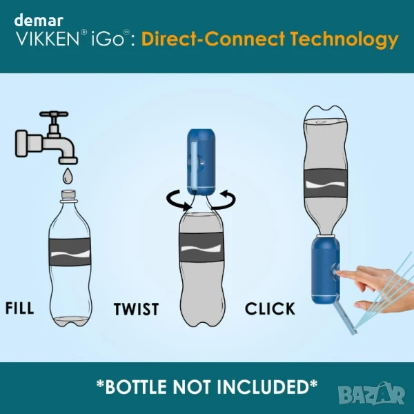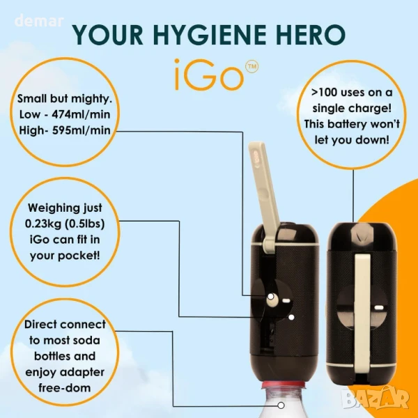 iGo е ултракомпактно и достъпно биде за пътуване, проектирано да работи със стандартни бутилки за газирана вода или вода (250–750 мл), елиминирайки нуждата от специален резервоар. Разполага с два режима на пръскане за регулируемо налягане, дълготрайна батерия, която се презарежда през USB (до 30 минути употреба), и херметична връзка за почистване без замърсявания. Леко и преносимо, само 140 г, е идеално за пътуване, употреба на открито или ежедневна хигиена. То предлага устойчива, удобна и ефикасна алтернатива на тоалетната хартия, където и да отидете.