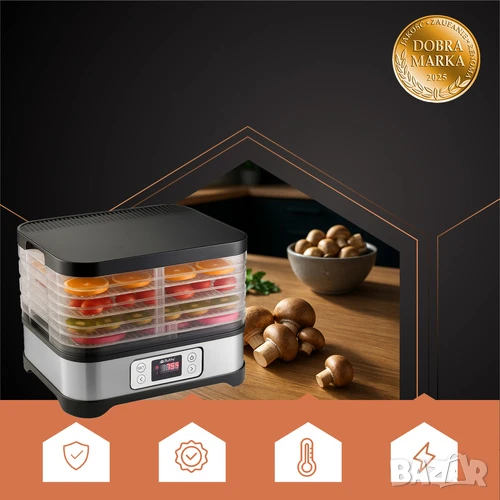Предназначен за по-дълги и интензивни сушилни сесии. Моделът разполага с механичен контролер със завъртащ се бутон, който е особено удобен при работа с мокри или замърсени ръце. Подходящ за потребители, които обичат да сушат на големи количества или по-бавни продукти като домати, кайсии и билки.