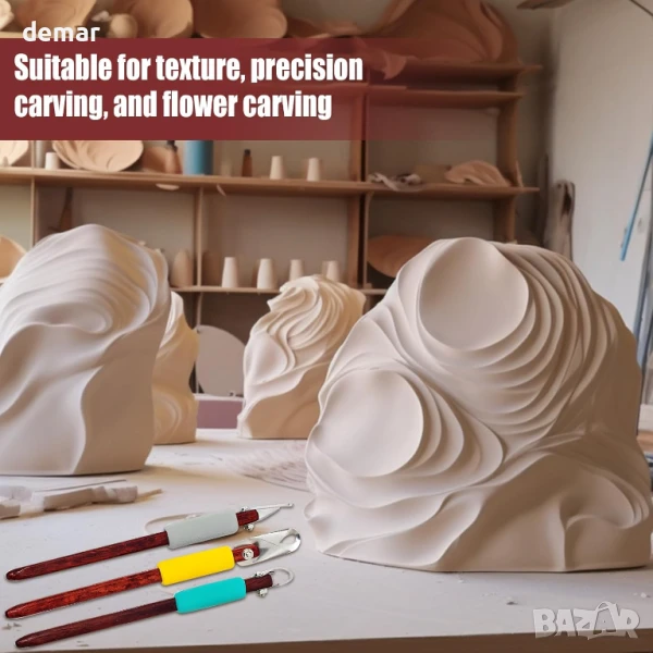 Този комплект от 3 инструменти за скулптуриране на глина предлага разнообразие от форми за гъвкава и детайлна работа и е изработен от издръжлив африкански падаук с остри глави от неръждаема стомана за ефикасно резбоване, оформяне и изглаждане. Ергономичните, противоплъзгащи дръжки осигуряват комфорт и контрол, идеални за дълги сесии на скулптуриране. Подходящ както за начинаещи, така и за ентусиасти, той е практичен избор за грънчарство, моделиране на глина, резба с восък и други творчески или технически задачи, а също така е и чудесен подарък.