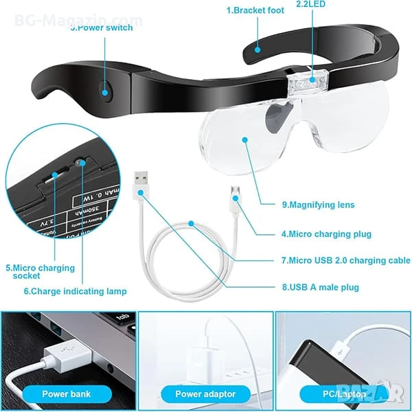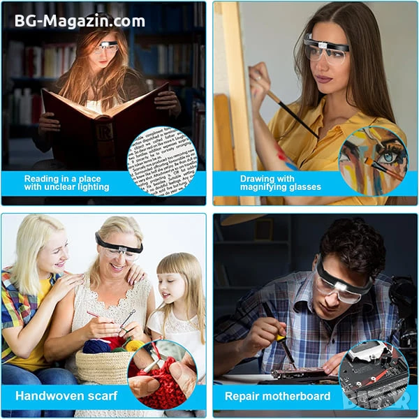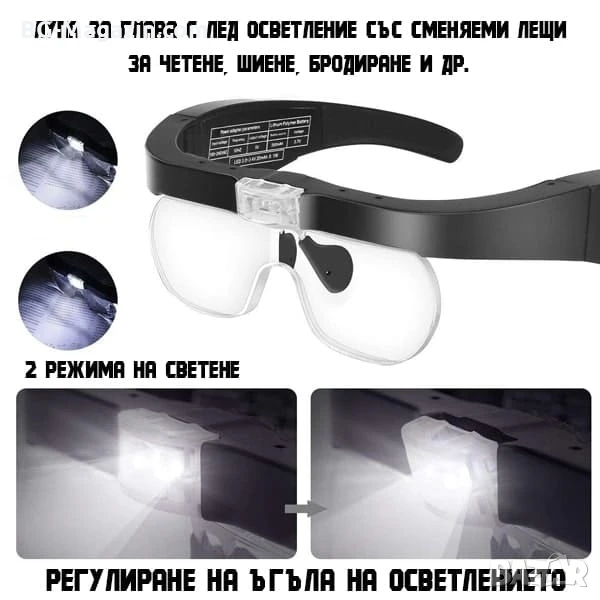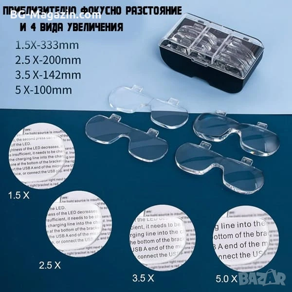 Акумулаторната лупа за глава LED осветление очила е висококачествен и многофункционален инструмент, който ще ви бъде безценен помощник при всяка задача, изискваща прецизност и детайлност. Нейното разнообразие от увеличения, регулируемото LED осветление, акумулаторното захранване и удобната конструкция я правят идеален избор за професионалисти и любители. Поръчайте своята акумулаторна лупа за глава LED осветление очила още днес и се насладете на удобството и ефективността, които тя предлага!
