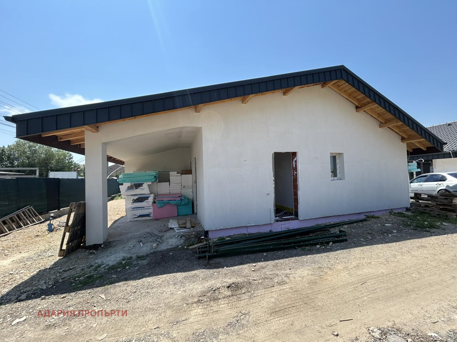 Фасадата на сградата е третирана с висококачествени материали включващи фасадна бяла и цветна мазилка. Топлоизолацията на къщата е EPS с дебелина 12см.