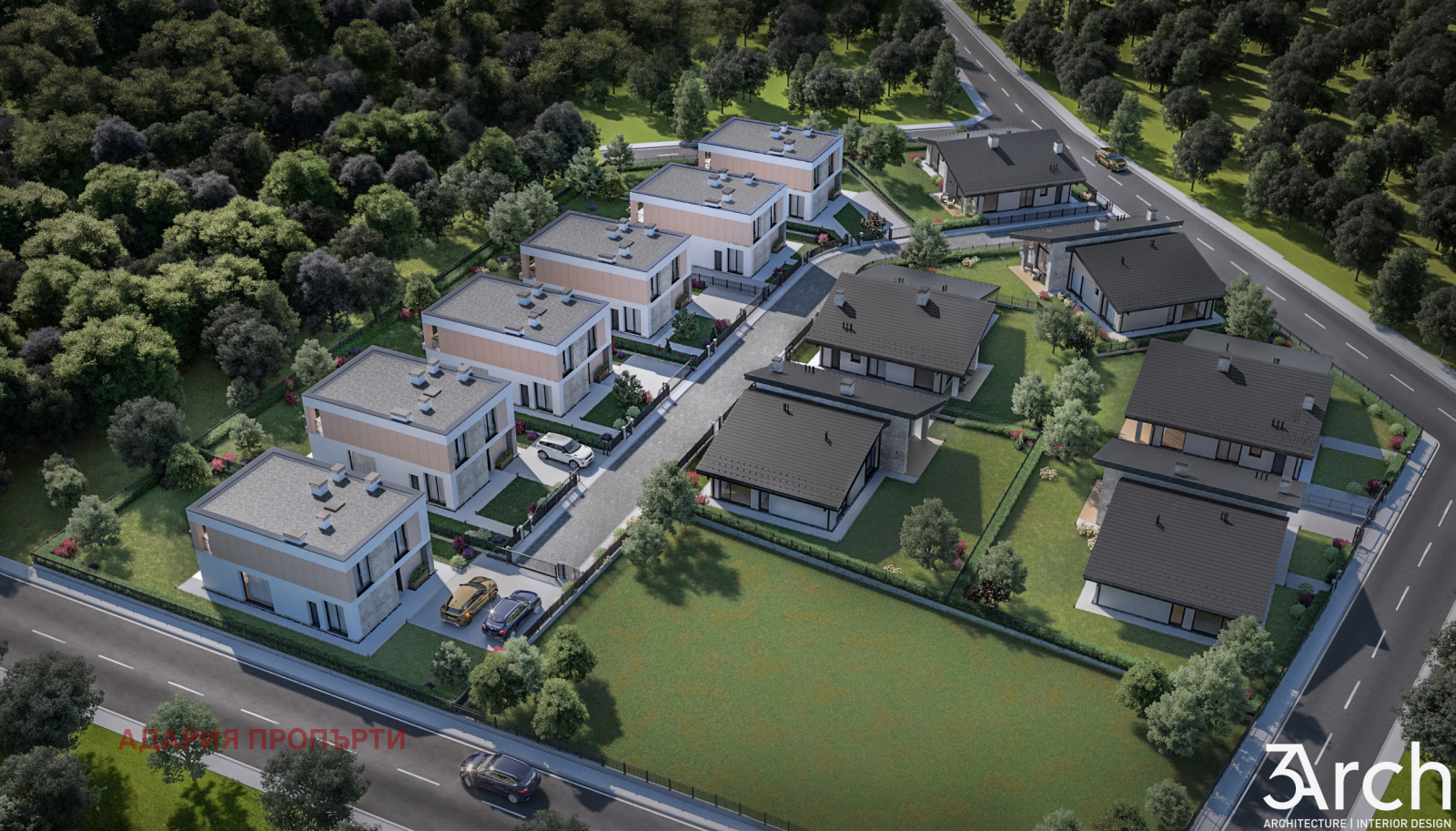Комплексът е съставен от 6 броя двуетажни и 6 броя едноетажни жилищни сгради, всяко от които е обособена в собствен УПИ. Жилищния пешеходен и автомобилен достъп към къщите е решен от североизток от новопроектирана улица. Имотите ще бъдат газифицирани и присъединени в новопроектирани водопровод и канализация. Към всяка къща има 2 паркоместа.