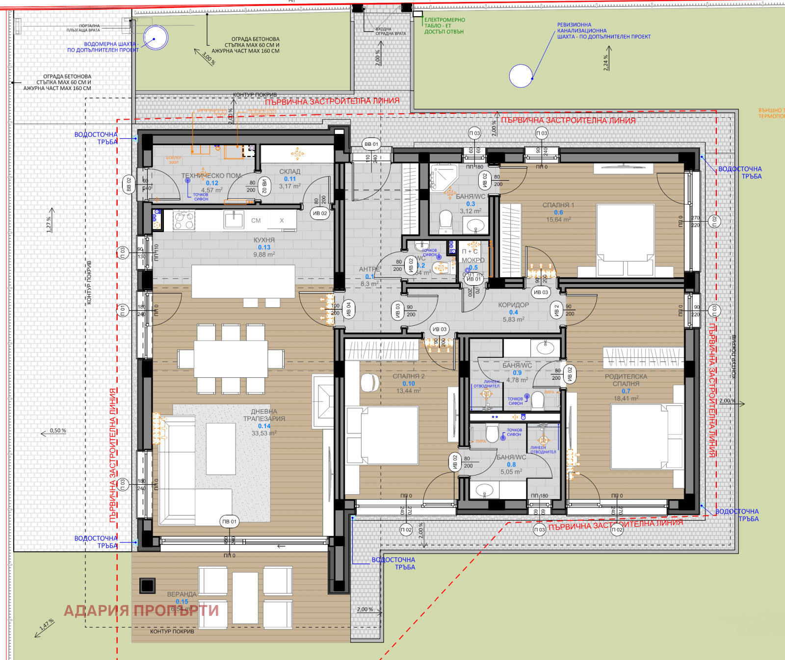 ЕТАЖ 0 ПАРТЕР: На това ниво са разположени следните помещения: антре, тоалетна за гости, мокро помещение, коридор, 3 спални с ъс собствени бани с тоалетни, склад, техническо помещение, кухня, дневна и трапезария, веранда.
