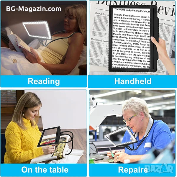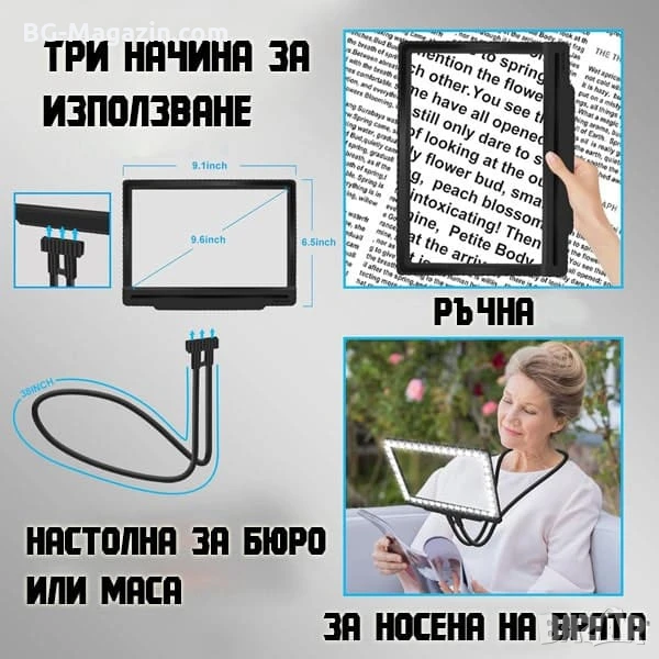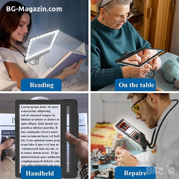 – 3-в-1 дизайн: Може да се носи на врата, да се държи в ръка или да се постави на маса като настолна лупа.