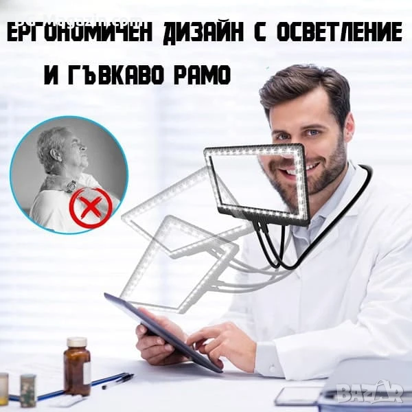 – Гъвкава шия: Позволява ви да позиционирате лупата под всеки удобен за вас ъгъл, освобождавайки ръцете ви за други задачи.