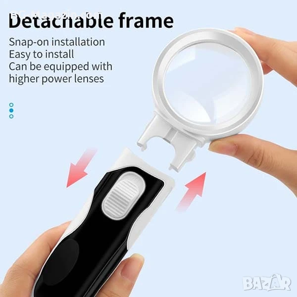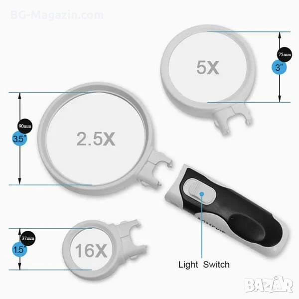 Представяме ви универсалната увеличителна мощна ръчна лупа с LED осветление – мощен и удобен инструмент, който ще ви помогне да виждате света в детайли, където и да сте. С три сменяеми лещи, осигуряващи различни увеличения, и вградено LED осветление, тази лупа е идеална за широк спектър от приложения – от четене на дребен шрифт до разглеждане на бижута, монети, марки и други обекти.