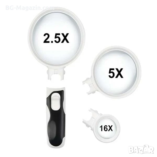 – Три сменяеми лещи: Комплектът включва три лещи с различни увеличения – 2.5x, 5x и 16x, което ви позволява да изберете най-подходящото увеличение за всяка задача.