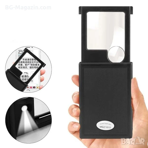 – Ярко LED осветление: LED осветлението осигурява ярко и равномерно осветление, което ви позволява да използвате лупата дори при условия на слаба осветеност.