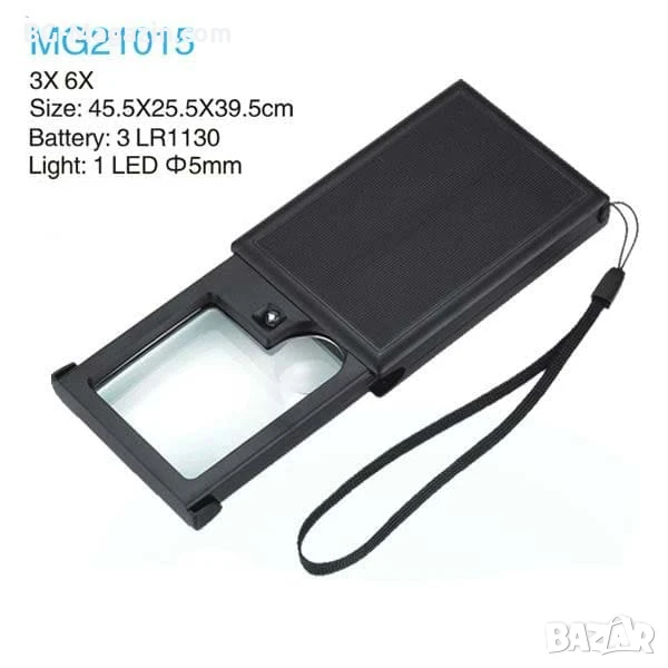 – Двойно увеличение: 3.0X и 6.0X увеличение ви позволяват да изберете най-подходящото ниво за всяка задача. 3-кратното увеличение е идеално за четене на дребен шрифт, разглеждане на карти, диаграми и други обекти, а 6-кратното увеличение е перфектно за детайлно разглеждане на бижута, монети, насекоми и други малки предмети.