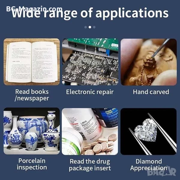 – Ремонт на часовници и други предмети: Разглеждане на малки детайли при ремонт на часовници, електроника и други предмети.