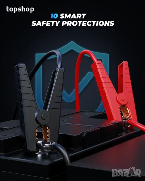 LED светлина в 4 режима: Зарядното устройство за автомобилен акумулатор е оборудвано с вградено LED фенерче, което е полезно при условия на слаба светлина или спешни случаи. То предлага 4 регулируеми режима на светлина: нормален, стробоскоп, SOS и цветен. Освен това, стартерът осигурява отлична защита за употреба в среди, вариращи от -4°F до 140°F.