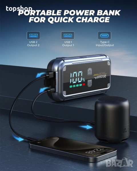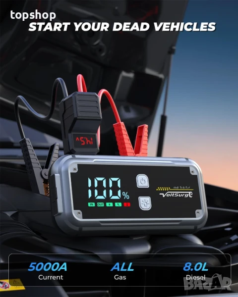 Захранване с батерия 5000A: Зарядно устройство за автомобилни акумулатори VoltSurge с пиков ток 5000A, безопасно стартиране на 12V превозни средства за секунди с този бустер (до 8.0L дизелови двигатели с бензинов двигател), до 50 стартирания с едно зареждане. Подходящо е за автомобили, камиони, мотоциклети, лодки, кемпери, трактори, косачки за трева, снегомобили и др.