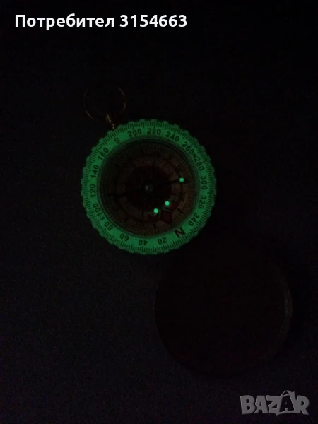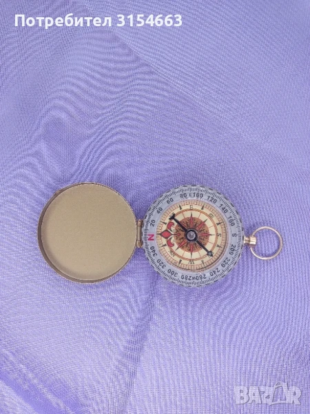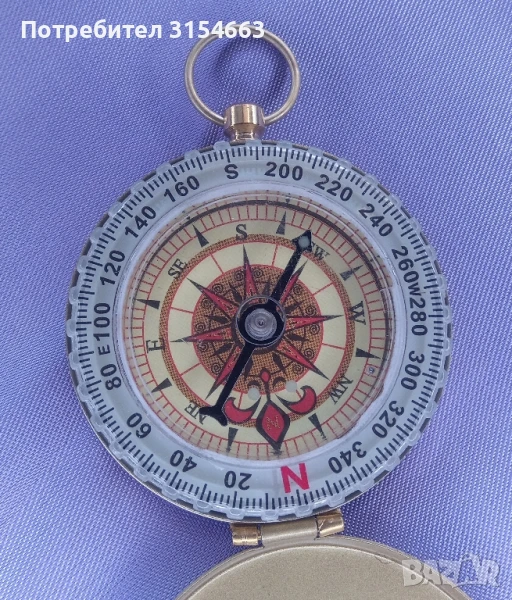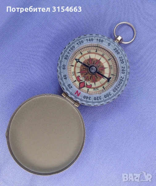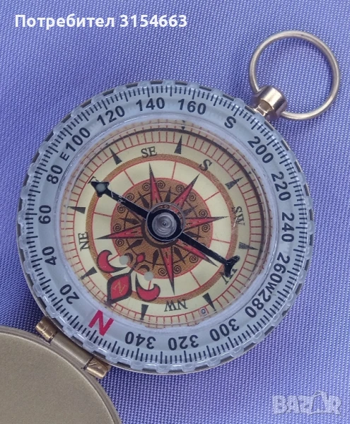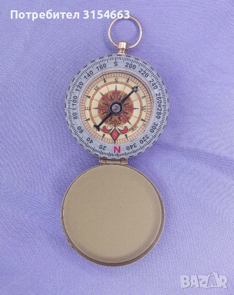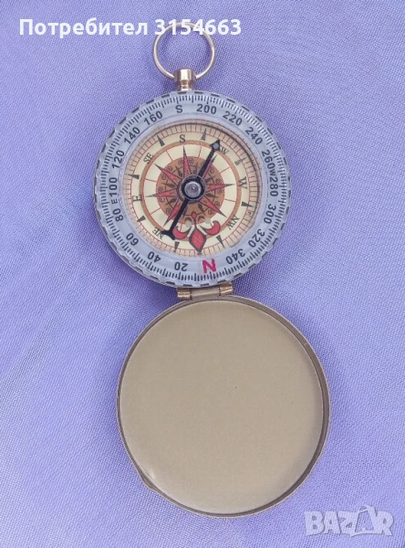 Компас - компактен и удобен. С метален пръстен за окачване. Гъвкава светеща стрелка. Медно покритие. Въртящ се на 360 градуса и светещ циферблат. С оригинална кутия.