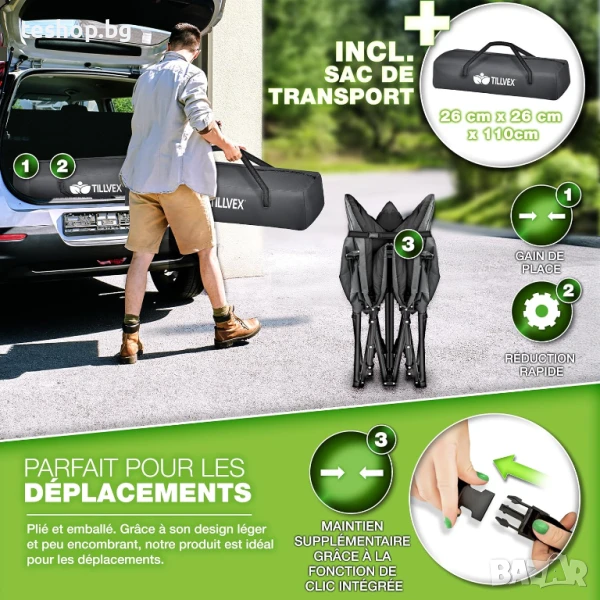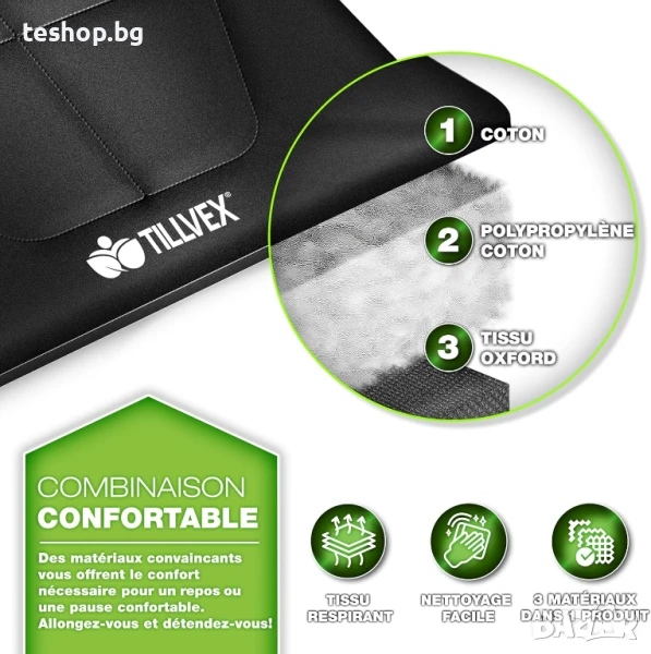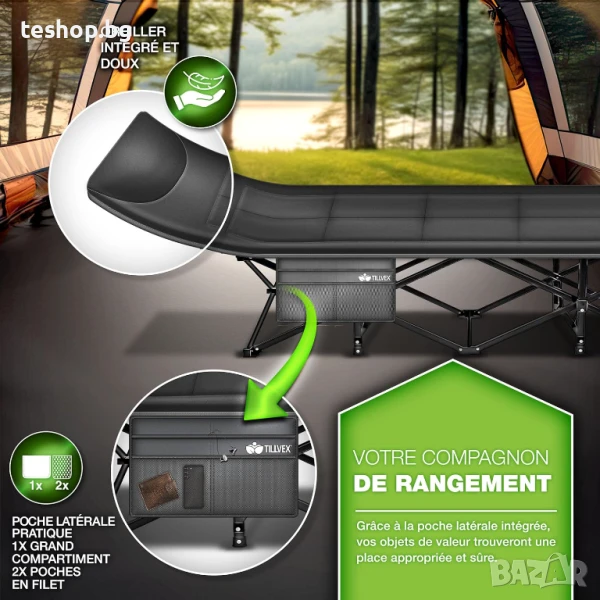 МЕКА ВЪЗГЛАВНИЦА ЗА ГЛАВА Нашият къмпинг стол tillvex е оборудван със супер мека възглавница, вградена в шезлонга. Този практичен дизайн ви спестява неудобството от разглобяването на възглавницата и осигурява непрекъсната релаксация. Вградената възглавница увеличава комфорта и ви позволява да се насладите по-добре на времето си за почивка. Тази добре обмислена функция прави къмпинг леглото идеално за градина, балкон, тераса, пътуване, къмпинг, плаж или като легло за гости. ЛЕСНО ЗА СГЛОБЯВАНЕ Походното легло е леко и сгъваемо, не изисква сглобяване и може да се разгъне за 10 секунди или да се сгъне в включената чанта за съхранение. Тази чанта го прави лесно за носене и прави сгъваемото легло идеално за употреба на закрито и на открито, като например туризъм, фестивали или като легло за гости. Шезлонгът е сгъваем и ви спестява време и усилия, позволявайки ви да се съсредоточите повече върху приключенията си.