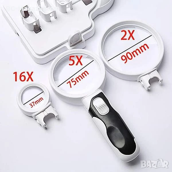 – Три вида увеличение: Сменяемите лещи предлагат увеличение от 2X, 5X и 16X, което ви позволява да изберете най-подходящото увеличение за всяка задача.
