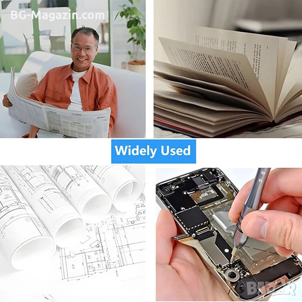 – Четене: Улеснява четенето на книги, вестници, етикети и други текстове с дребен шрифт.
