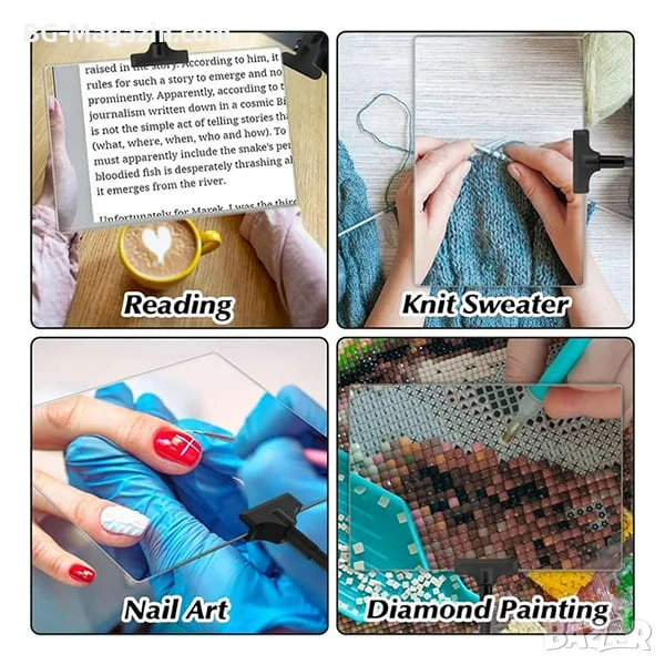 – Шиене и бродиране: Помага за по-лесното виждане на бримки и детайли при ръкоделие.