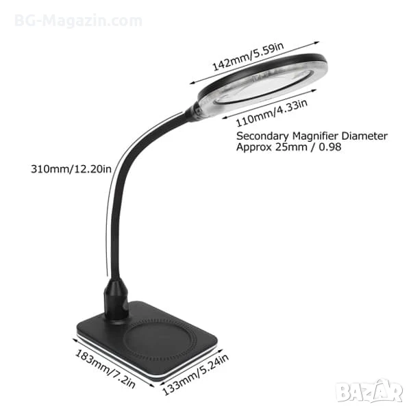 Представяме ви голяма увеличителна настолна лупа с LED осветление – универсален инструмент, който ще ви помогне да виждате детайлите по-ясно и удобно от всякога. Тази лупа е идеална за широк спектър от задачи, изискващи прецизно увеличение и добро осветление.
