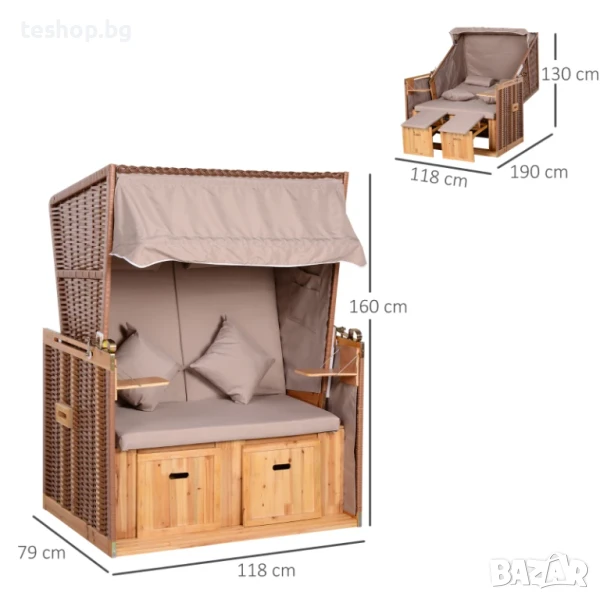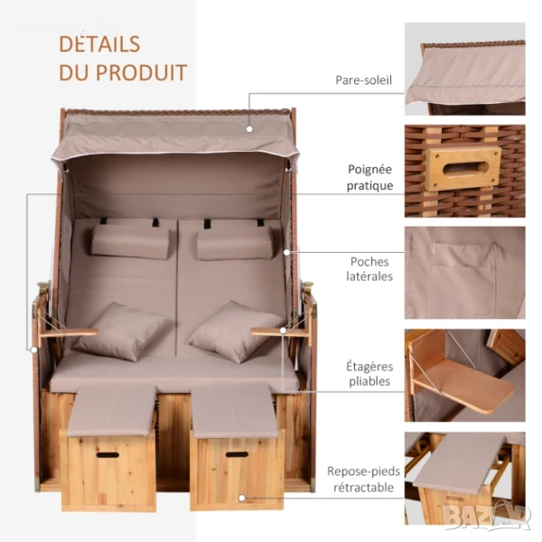 Шезлонг / легло с навес 2-местен плажен / градина лукс колекция в кафяво Шезлонг / легло с навес 2-местен плажен / градина лукс колекция в кафяво