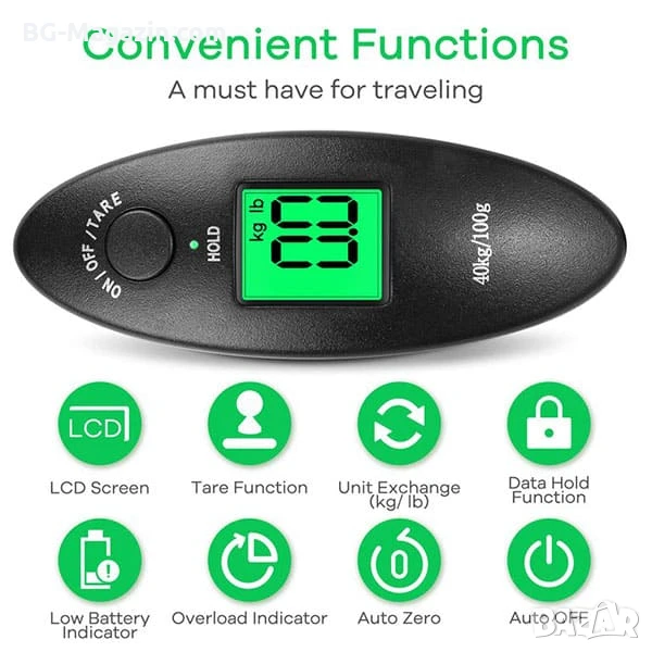 – Удобна каишка: Каишката за захващане осигурява сигурно и удобно закрепване на кантара към багажа или друг предмет.