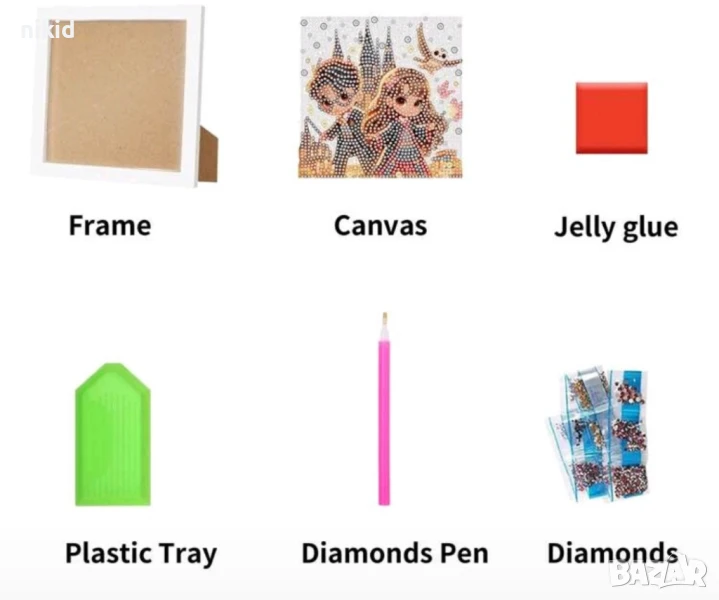 + купичка за мъниста и картина с фолио,която има готово нанесен слой лепило и по дадените цветове се залепват камъчета,много лесно,приятно и отморяващо,подходящо дори и за деца, не изисква особена сръчност и умения