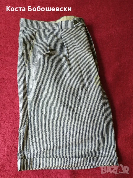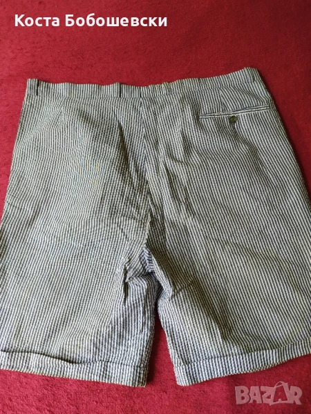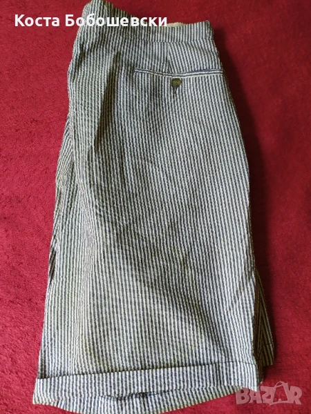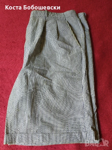 Продавам мъжки къси панталони с размери както следва, талия 104см, ханш 124см. Произведени от висококачествен памук, цвят бяло-сиво вертикално райе. С басти и маншет. Заслужават си.