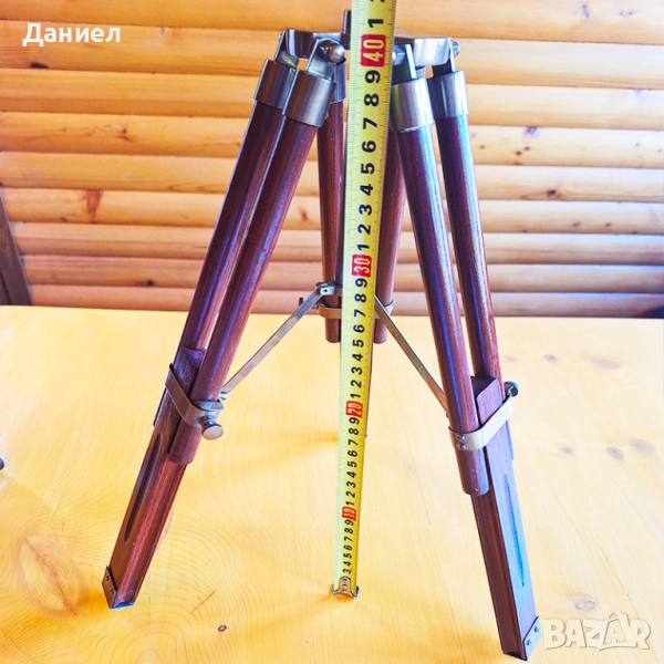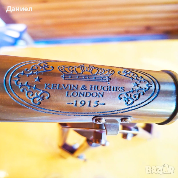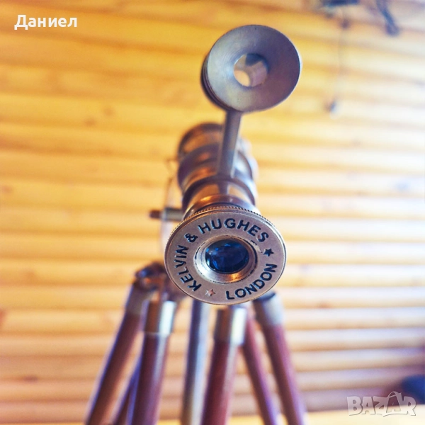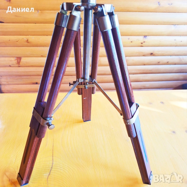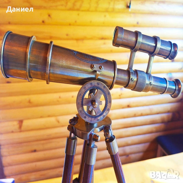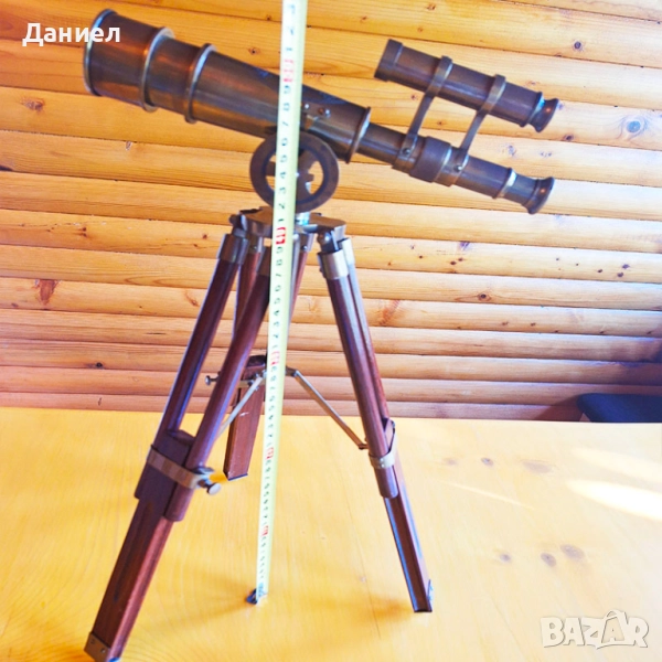 Изработен от висококачествен бронз, далекогледът е с автентична ретро визия, напомняща на класическите морски навигационни уреди. Масивната дървена тринога придава стабилност и завършеност на цялостния дизайн, превръщайки го в акцент за всяко помещение.