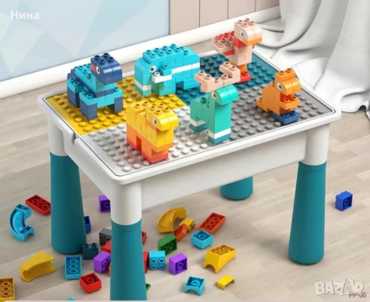 Плотът на масичката е с две страни. Едната основа е гладка, а другата е основа за конструктор. Самата масичка може да се пълне с пясък или с вода... 🛟🌊 Игрите с конструктор развиват логиката, фината моторика, координацията око - ръка и въображението на детето.