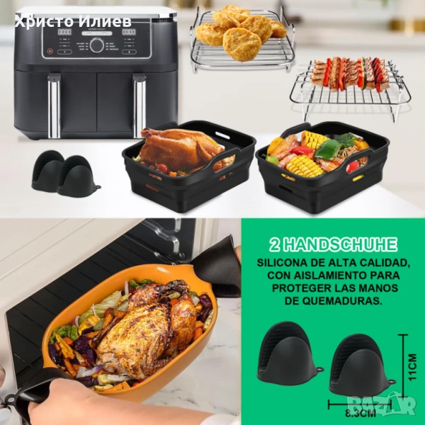 - 【Безпроблемно обслужване на клиенти】: Този комплект включва 2 x силиконови форми за многократна употреба за двоен фритюрник с горещ въздух, 2 x решетки за готвене и чифт силиконови ръкавици.