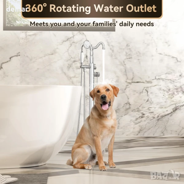 Хромиран свободностоящ смесител за вана, ръчен душ с гъвкав маркуч, 2 изхода за вода, монтаж на пода