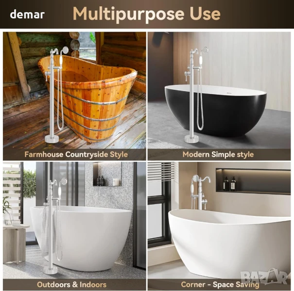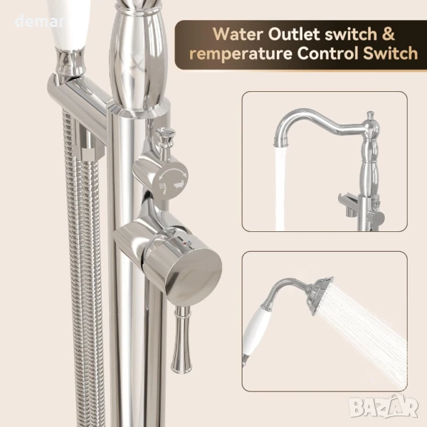 Този свободностоящ смесител за вана е лесен за монтаж без промени в стената и се вписва идеално дори в малки бани или ъгли. Той разполага с два изхода за вода - основен кран за пълнене на ваната и ръчен душ за къпане или почистване - предлагайки многостранна употреба. Комплектът включва всичко необходимо за монтаж, включително тръби за топла и студена вода, ръчен душ с маркуч и еднолостов регулатор на температурата за лесно регулиране. С хромирано покритие, той допълва както модерните градски бани, така и винтидж селските стилове.