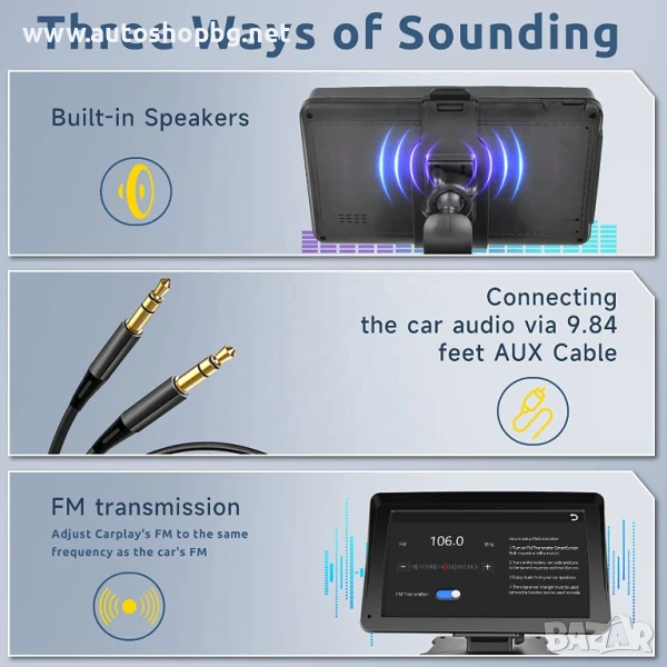 4. Може да предава звука от устройството към оригиналната аудиосистема на автомобила чрез FM емисия и AUX линия.