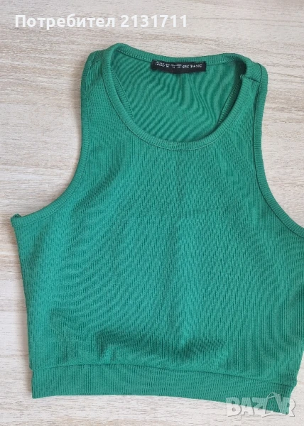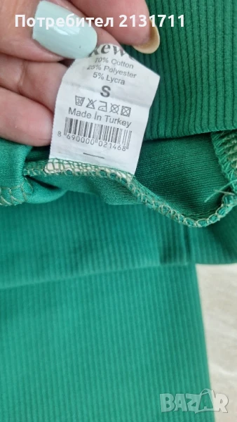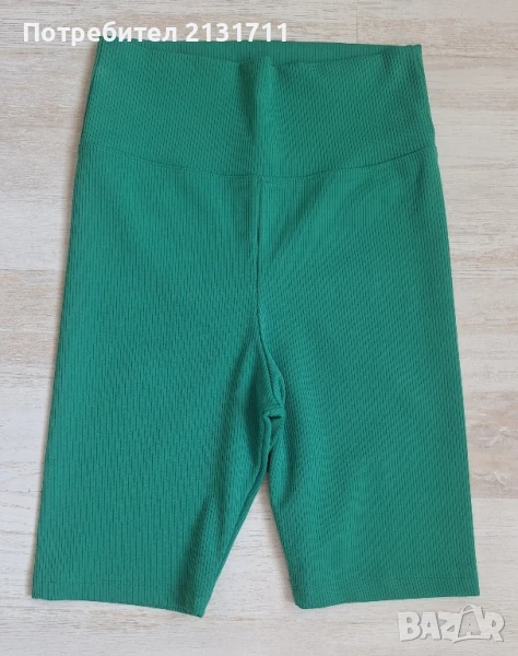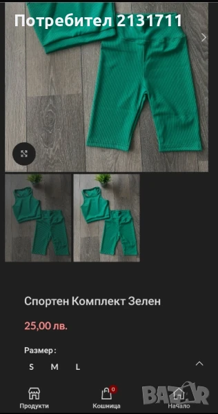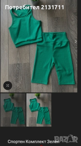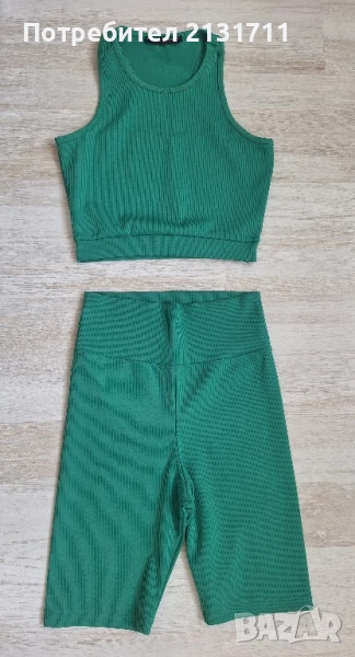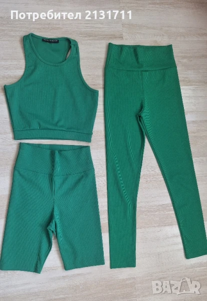 Спортен комплект плюс клин в същият цвят и материя. Клинчетата са размер С, а горната част размер М. Цветът е много по наситено зелено, но не мога да го снимам с телефона реално. Материята е рипсена Обличани са не повече от два - три пъти, за малко, защото ми стоят много впити и не се харесвам. Цената е съобразена и с куриерската услуга.