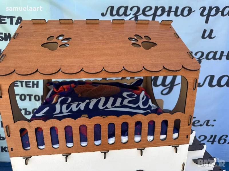 🔨 Опция: Къща с етаж, прозорчета, вратички, възглавничка или гравирана табелка “Домът на Бела и Пухи”