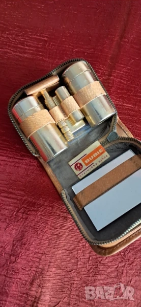 Стар комплект несесер за бръснене-Солуна Чехословакия,комплекта съдържа видно на снимките, кутийки за сапун,четка,размазвача,Огледало, ножчета,самобръсначка Солуна брандирана в несесер от естествена кожа и функциониращ цип,същият е за колекционери, интериор,декор, и по предназначение.